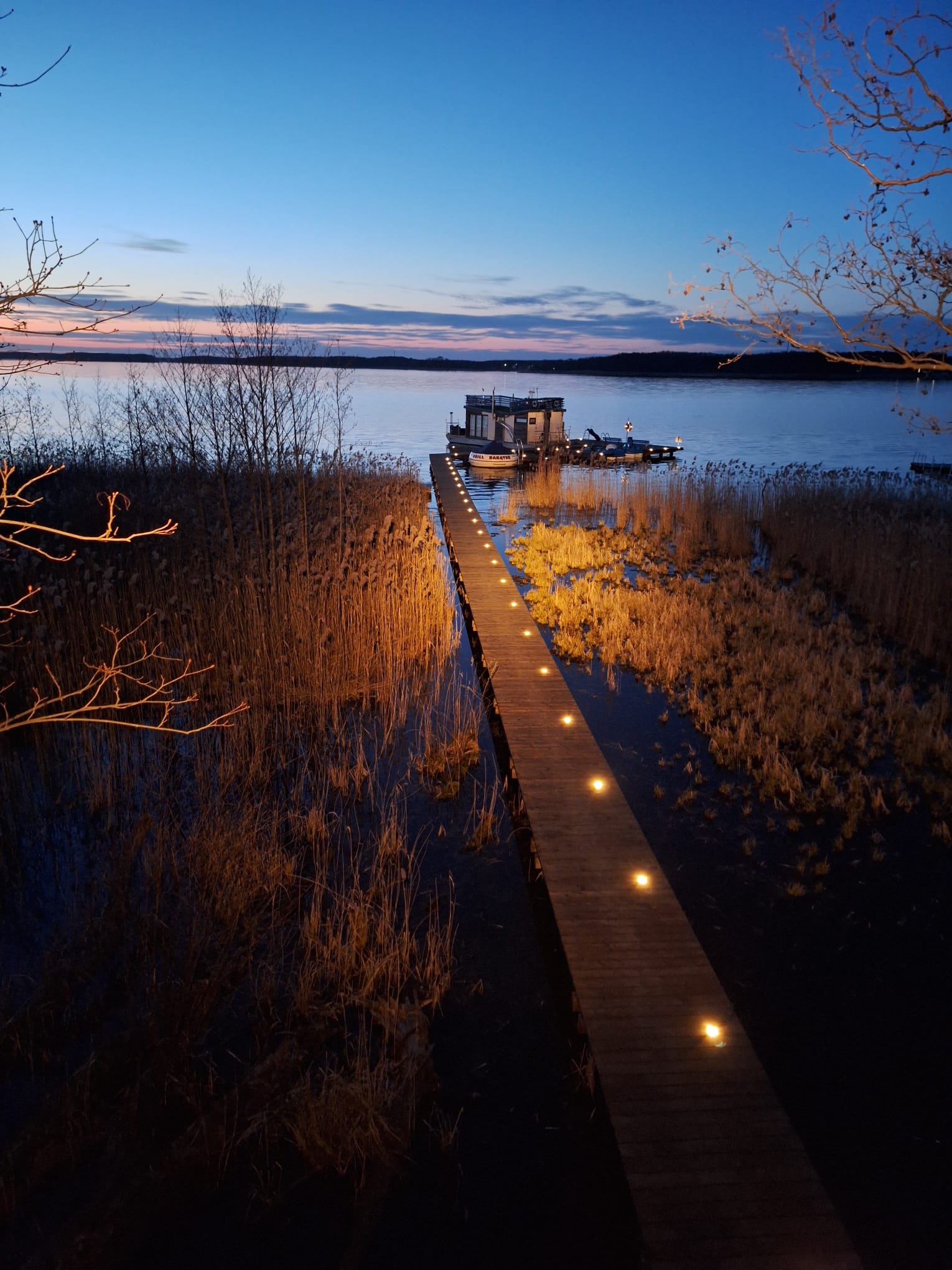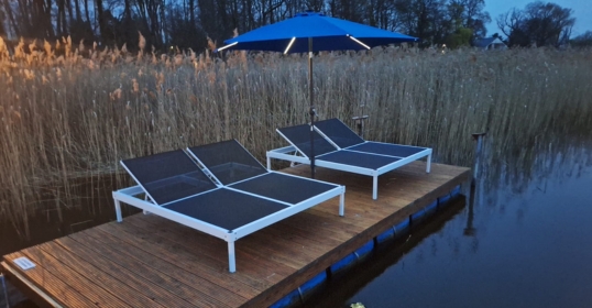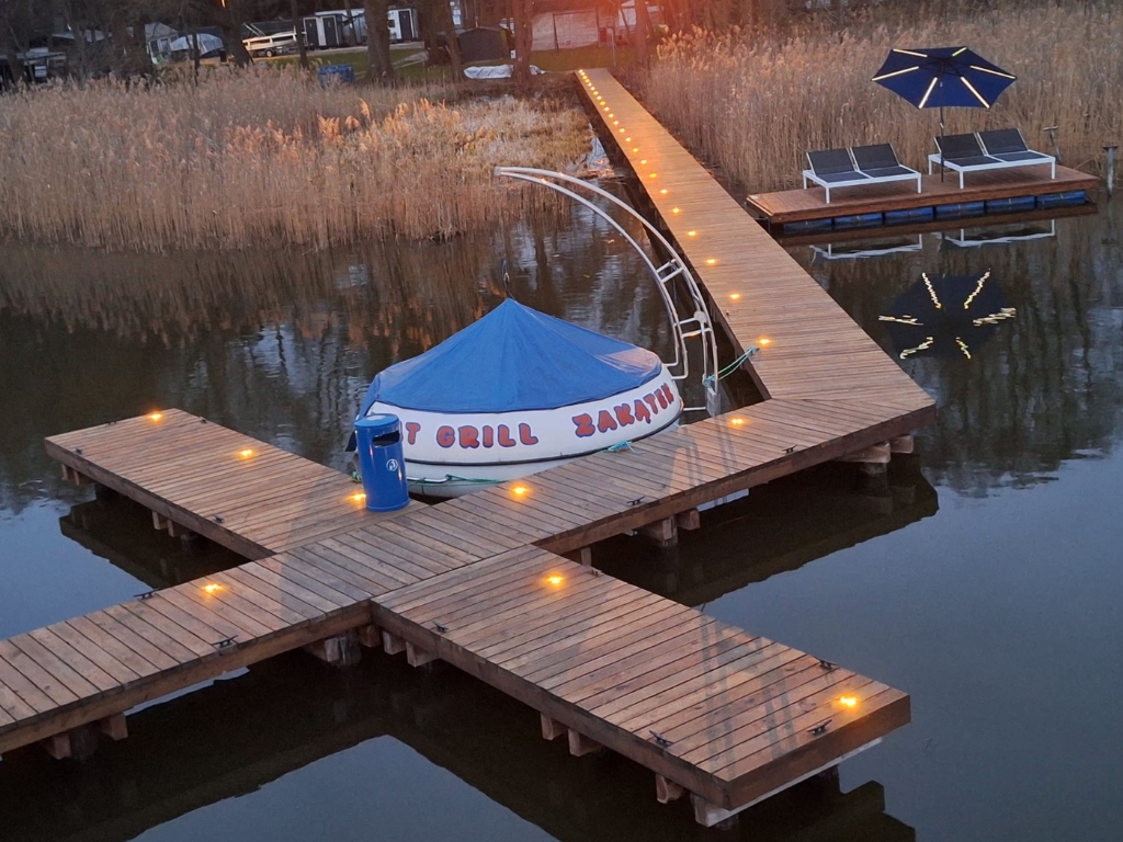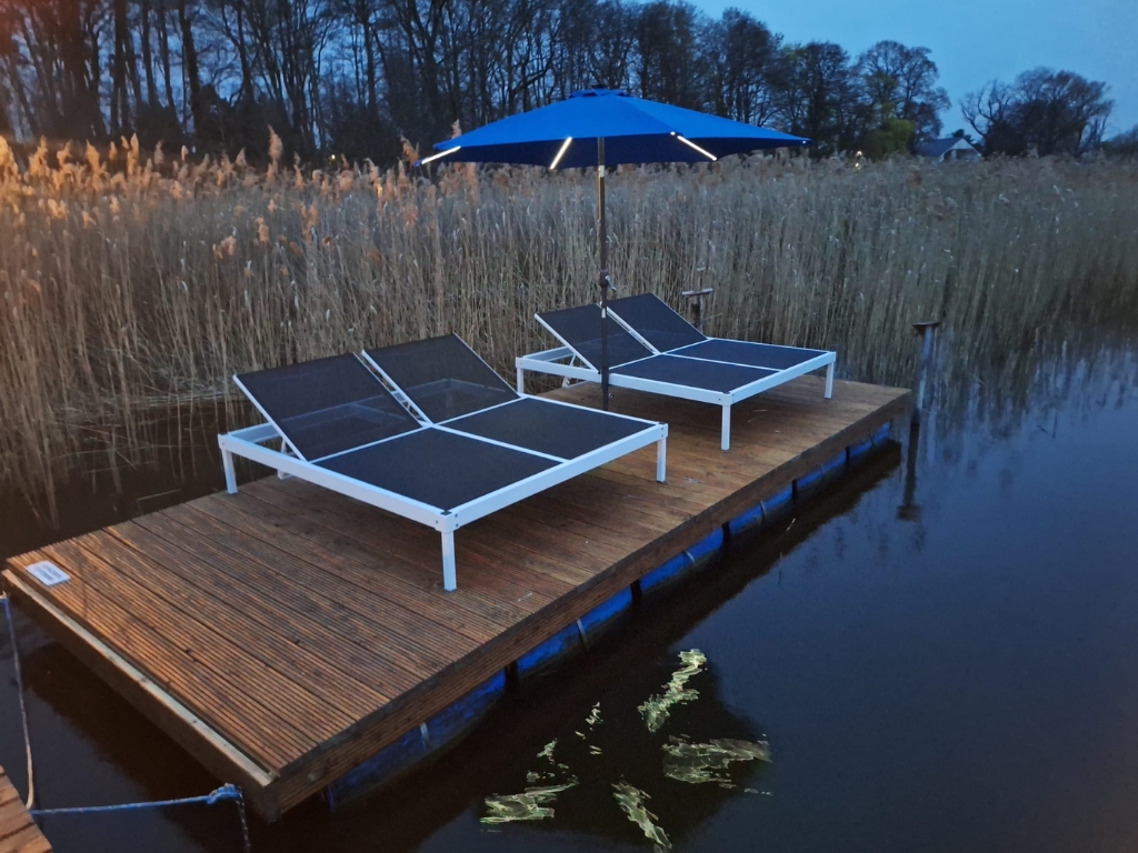 Klientom udostępniamy duży, prywatny pomost nad brzegiem jeziora Sławskiego. Pomost posiada platformę do opalania o wymiarach 11x4m.